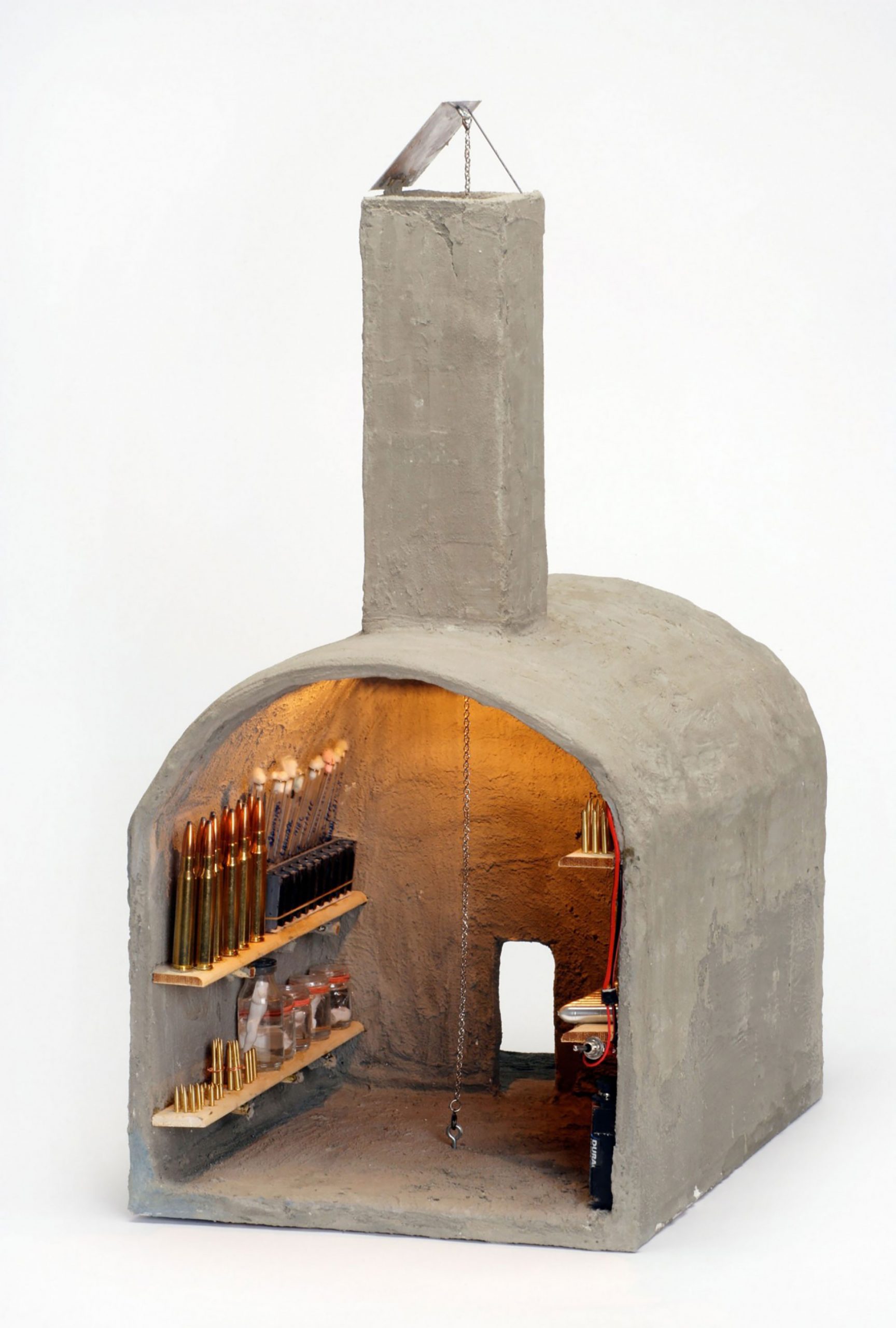 SCHUILKELDER-ATELIER MET EEN EENDEKOP EN COMMUNISTISCHE HAMER