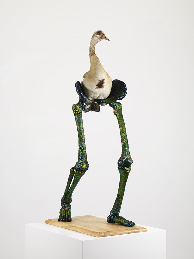 2015 Mixture of jewel beetle wing-cases, polymers, stuffed bird 126 x 37 x 67 cm Sculpture