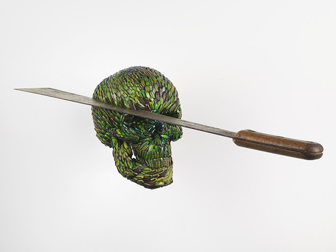 2013 Mixture of jewel beetle wing-cases, polymers, leather 90 x 49 x 22 cm Sculpture